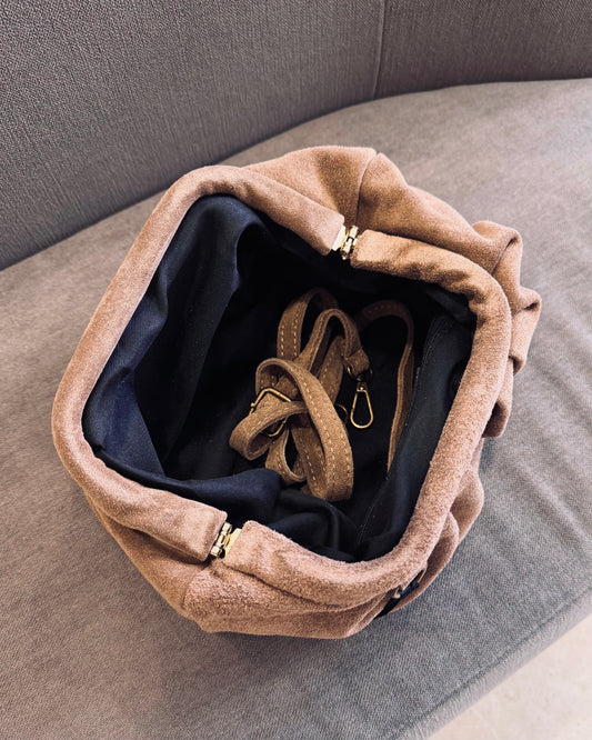 Veloursleder-Handtasche mit Bügelverschluss in Camel - Made in Italy
